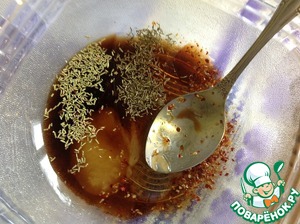 Смешать соевый соус, мед, масло и все специи. Тщательно перемешать маринад