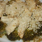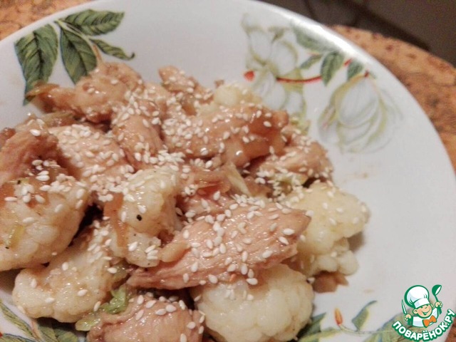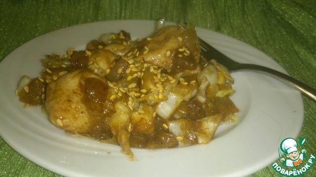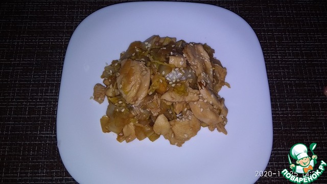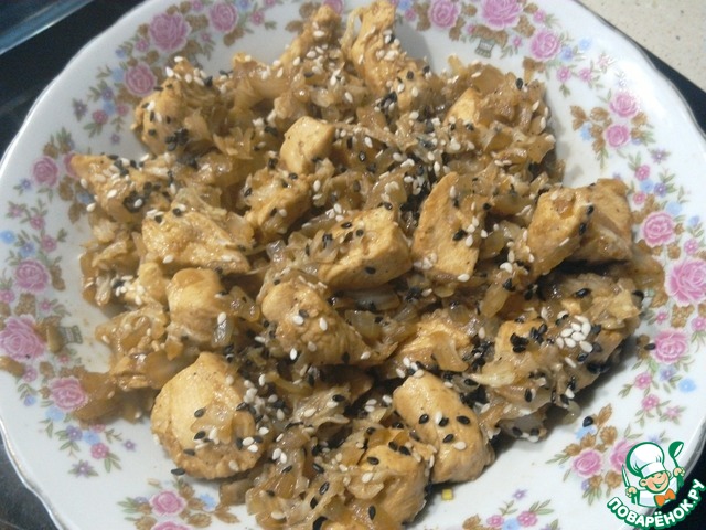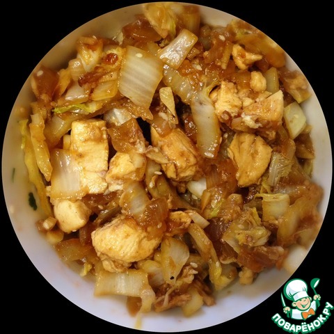 На большой сковороде (желательно, в воке; главное не использовать сковороду с тефлоновым покрытием!) разогреть на большом огне 2 ст. л. растительного масла до появления дыма. Добавить нарезанный лук и жарить при непрерывном помешивании в течение минуты. Затем добавить пекинскую капусту и чеснок и жарить 3 минуты. Не забываем постоянно помешивать, иначе все сгорит! Вылить соус. Когда он забурлит, добавить курицу, снизить огонь до среднего и готовить 2 минуты. Готовое блюдо посыпать кунжутом.