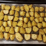 Выкладываем наш картофель на противень (или форму\сковороду - в зависимости от того, чем располагаете) в один ряд, чтобы приготовление происходило равномерно.