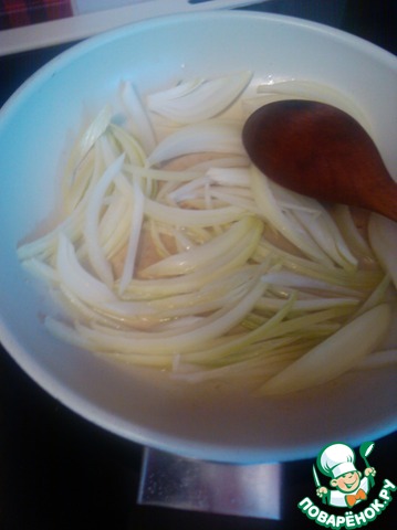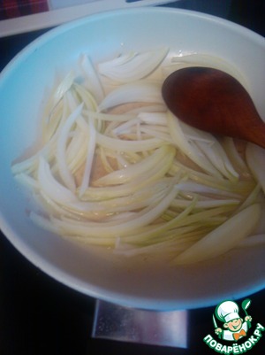 • Тем временем нагреваем в сковороде масло, добавляем нарезанный "перышками" лук и слегка его обжариваем