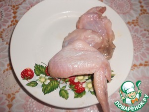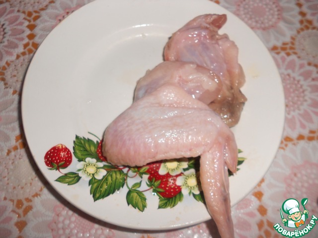 • Куриные крылышки полить маринадом, закрыть в контейнере и поставить в холодильник на 1 час.