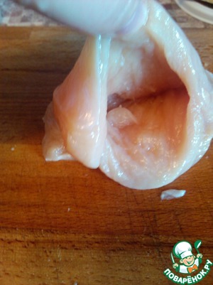 Куриную грудку надрезаем слегка
