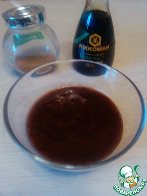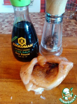 • Со всех сторон натираем её соевым соусом "Киккоман" и перцем. Оставляем мариноваться около 20 минут