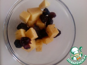 • Тем временем запариваем кипятком и промываем изюм, сыр нарезаем мелким кубиком - смешиваем