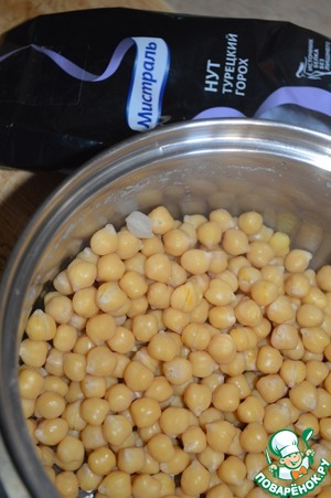 Нут замочить и приготовить как указано на упаковке. Воду слить, оставить немного отвара. Нут остудить.