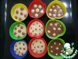 Смазать формочки для кексов растительным маслом "Олейна". Распределить тесто по формам, заполняя каждую на 3/4, при этом оставить каждого вида теста по 2 ст. л.. В оставшееся тесто добавить столько муки, чтоб оно получилось, как густая домашняя сметана. Разложить тесто в уголки полиэтиленовых мешочков, края уголков чуть-чуть срезать. Вместо мешочков можно воспользоваться специальными кондитерскими мешочками или шприцами.