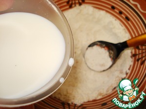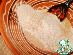 Приготовим тесто. Смешаем муку, дрожжи и немного соли.