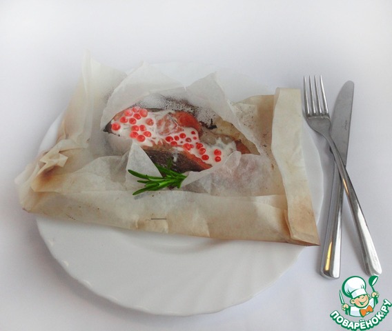 Вынимаем рыбу из духовки. Перед подачей разрезаем конверт крестообразно. Отгибаем края, поливаем рыбу соусом, украшаем розмарином и можно подавать!