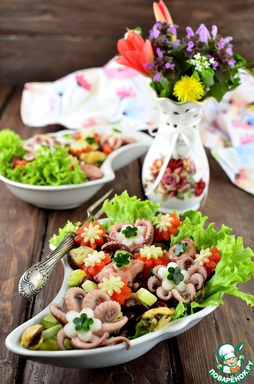 Рецепт «Салат с фасолью и морепродуктами "Первые цветы"»:
