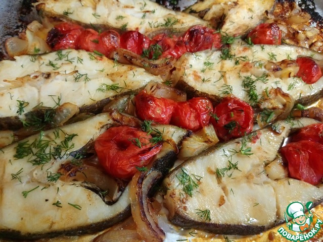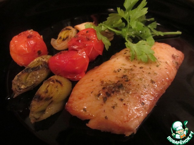 Рецепт «Палтус, запечённый с пореем и помидорами черри»: