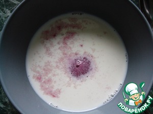 Приготовить крем. В микроволновке подогреть молоко до горячего состояния и всыпать в него смесь для приготовления малинового желе. Всё хорошо перемешать в течение нескольких минут (так написано на упаковке желе) и слегка охладить