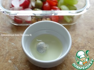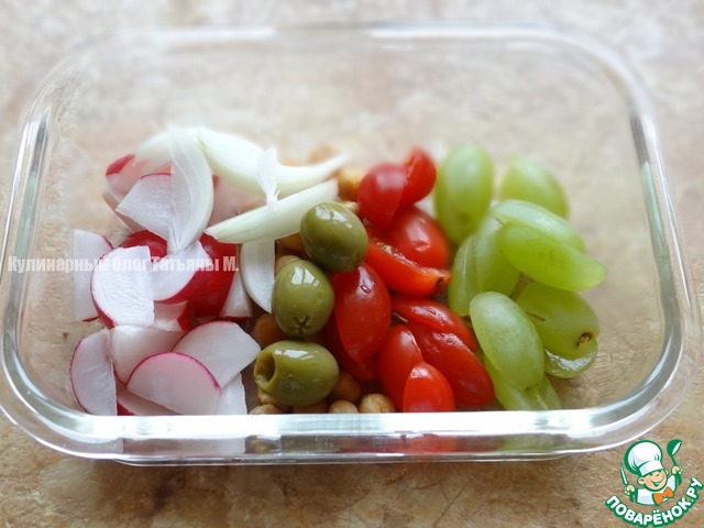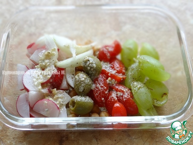 • Виноград и томаты порезать вдоль, добавить нут, и резанный редис;