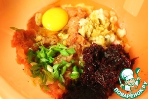 • Зеленый лук мелко нарезать, свеклу натереть на мелкой терке. Все это добавить к фаршу.