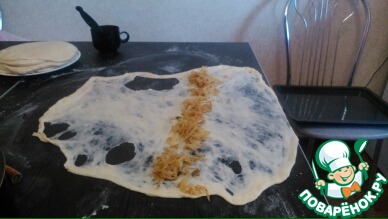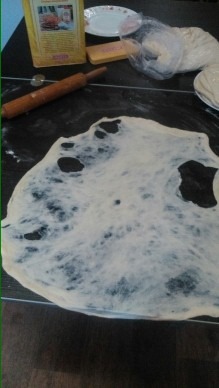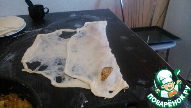 Берем по одной лепешке, перекладываем на стол и начинаем растягивать от середины к краям по кругу. У меня тесто порвалось, я люблю раскатывать потоньше, но оно получается еще вкусней.