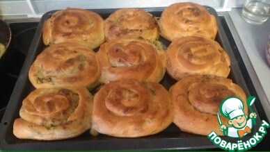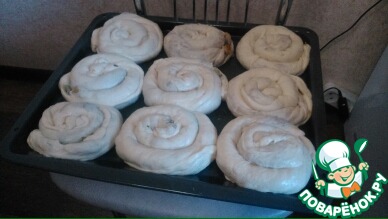 Сворачиваем трубочку в "улитку" и выкладываем на противень по три штуки в ряд.