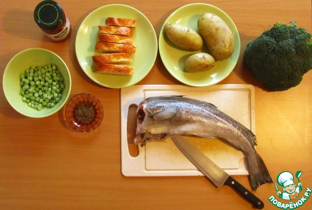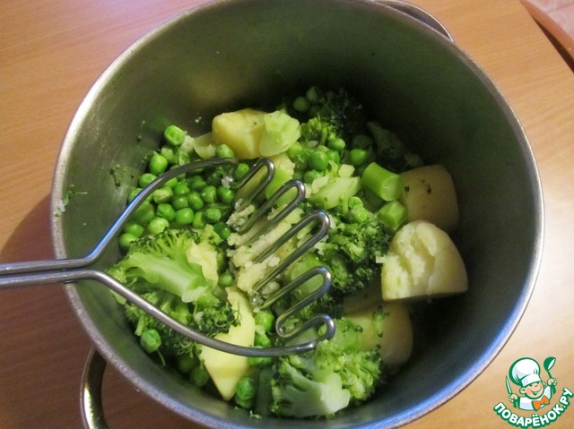 Пока запекается рыба, приготовим деревенское картофельное пюре. Картофель почистите и варите до почти полной готовности в подсоленной воде. Брокколи помойте, разделите на соцветия и варите вместе с картофелем 5 минут. Горошек добавьте в кастрюлю и продолжайте варить еще 3 минуты.