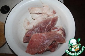 Берем кусок свиного окорока, разделываем. Отделяем сало, кости и шкуру (кости и шкура нам в рецепте не понадобятся, из них варим суп). Исходя из полуторокилограммового куска получилось 1050 г мяса и 250 г сала. Из этой массы, и берем остальные ингредиенты Сало пока кладем в морозилку.