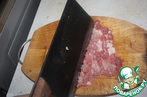 Мясо нарезаем мелкими кубиками и топориком или тяжелым ножом меленько рубим (можно воспользоваться мясорубкой, но это неправильно)