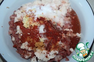 Добавляем, соль, вино, раздавленный чеснок, все специи. В правильном рецепте чоризо необходима копченая паприка, но, если у Вас в городе, также, как у нас, она не продается, то заменяйте обычной паприкой сладкой или острой в зависимости от Ваших предпочтений в остроте. Я взял 35 г сладкой паприки и 5 г острого перца. Если боитесь ботулизма, то замените половину обычной соли нитритной. Но я считаю, что в тонкой колбасе в свиной кишке при вялении в холодильнике у бактерий ботулизма мало шансов размножиться.