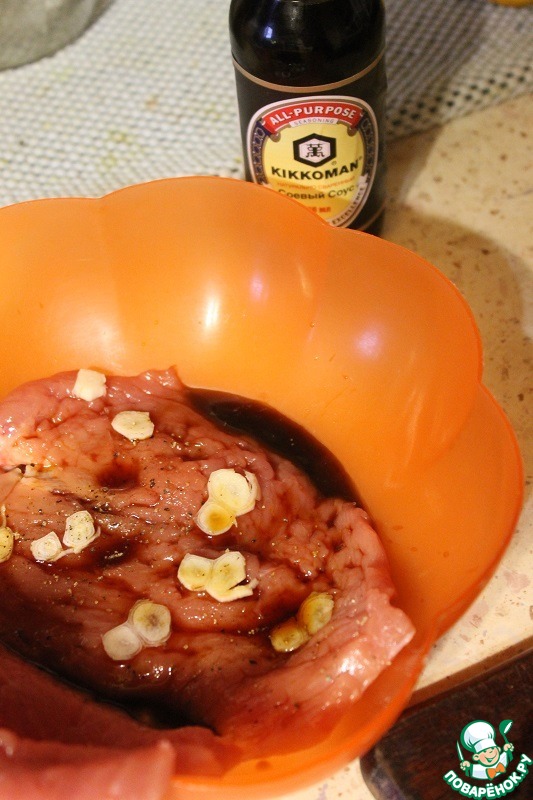 Теперь наливаем немного соевого соуса в глубокую миску, режем дольками чеснок, кладем отбитое мясо, заливаем сверху опять соевым соусом и присыпаем чесноком. Накрываем миску фольгой и убираем в холодильник на пару часов. (Я мариновала ночь).