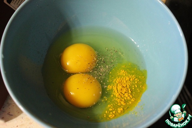 Для омлета: яйца смешать с молоком, солью, перцем и куркумой. Слегка взбить венчиком и вылить в сковороду с 1 ст. л. растительного масла и накрыть крышкой. Пожарить ровный яичный блинчик.