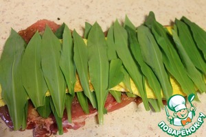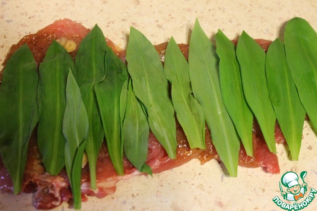 Мясо достать из маринада, разложить на рабочей поверхности, сверху выложить листочки черемши.