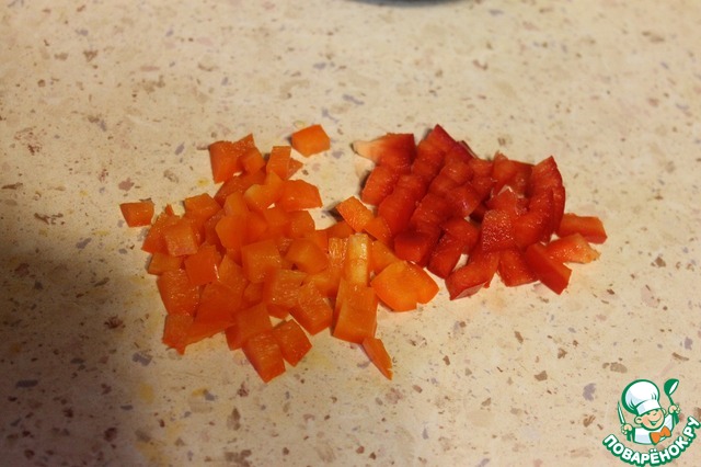 Для сальсы: помидор, огурец и два вида перца (красный и оранжевый) нарезать мелкими кубиками.