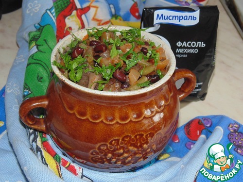 В этом блюде я решила совместить фасоль Мехико, которая используется для приготовления мексиканских блюд, и наши русские традиции. И вот такие горшочки получились. Фасоль отлично сочетается с лесными грибами и получается сытное, постное блюдо.