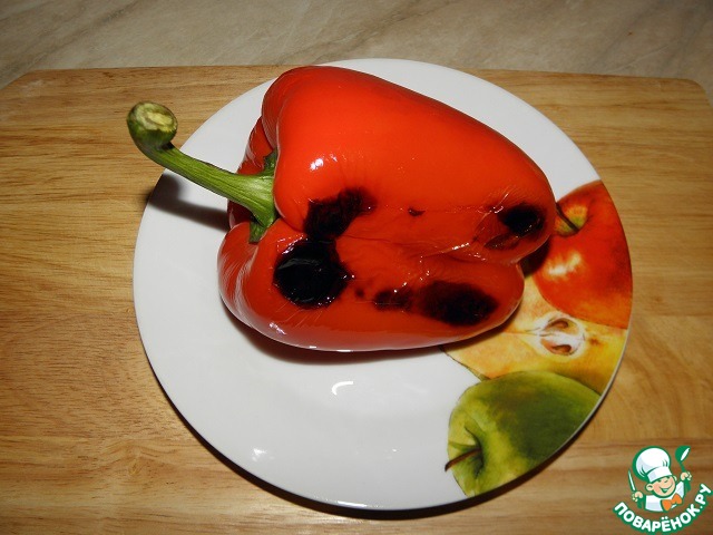 Перец смазать растительным маслом и запечь в духовке 15минут до мягкости, затем снять шкурку и нарезать мелким кубиком