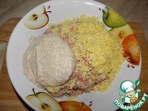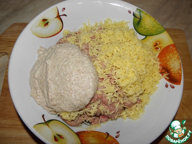 Добавить к фаршу сухарную смесь и мелко натертый сыр