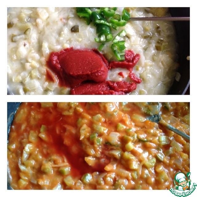 Добавляем томат пасту и острый перец порезанный полу кольцами. Перемешиваем и даем закипеть.