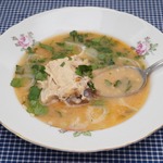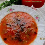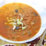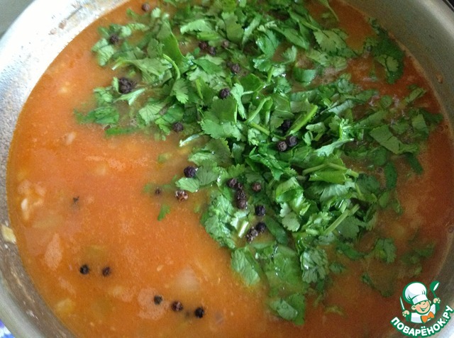 Соус выкладываем в кастрюлю с мясом, быстро перемешиваем, и убавляем огонь. Добавляем соль, перец горошком и порезанную кинзу. Даем супу закипеть, и оставляем еще на 5 минут после закипания. Подавать суп с зеленью и репчатым луком нарезанным кольцами.