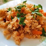Засыпаем морковь. Через пару минут все аккуратно перемешиваем, чтобы не разломать морковь. Так мешая, жарим 10-15 минут. До появления запаха плова.