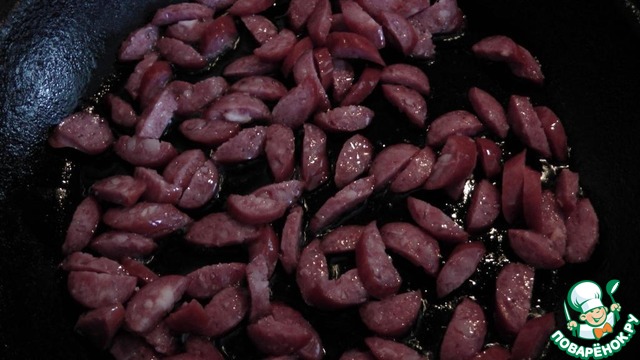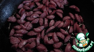 На жиру после колбасок обжариваем лук и чеснок до золотистого цвета.