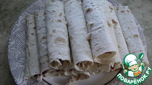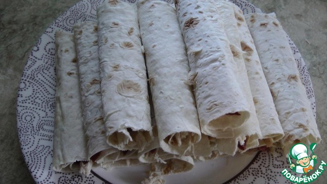 Куриную смесь выкладываем на листы лаваша или тортильи и скручиваем рулетом. У меня был круглый лаваш, я его разрезала на 4 части.