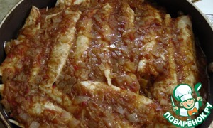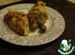 В форму наливаем половину соуса, укладываем на них рулеты и поливаем другой половиной соуса, посыпаем натертым сыром и ставим в духовку на 15 минут.