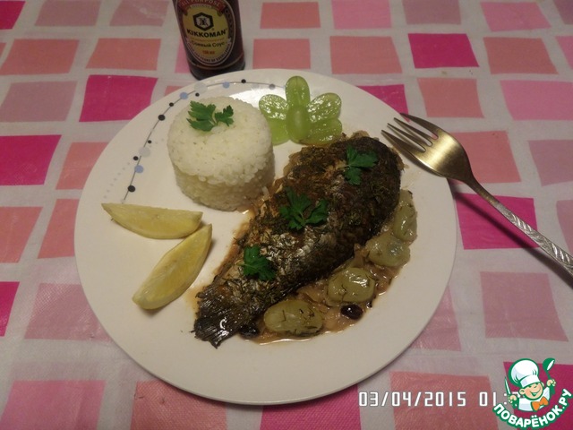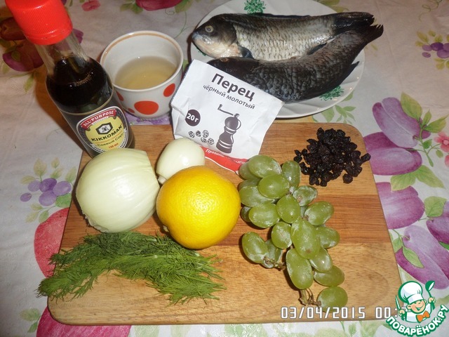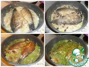 Сверху на лук выкладываем карасей, затем промытый изюм, виноград, молотую паприку и зелень. Закрываем крышкой и готовим 10-15 минут на медленном огне. Тем временем отвариваем рис для гарнира.