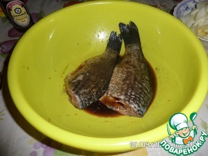 В чашку кладем карасей и добавляем соевый соус и черный молотый перец. Оставляем на 10-15 минут. Нужно 2-3 раза рыбу перевернуть, чтобы пропиталась маринадом с обеих сторон.