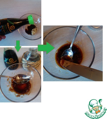 Смешать соевый соус "Киккоман" и измельченный чеснок.