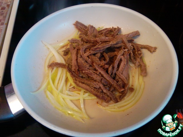 Добавить к луку нарезанную говядину и обжаривать еще 1 минуту