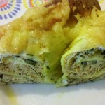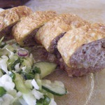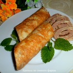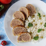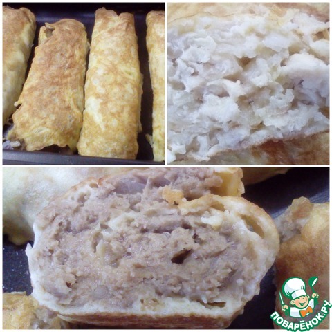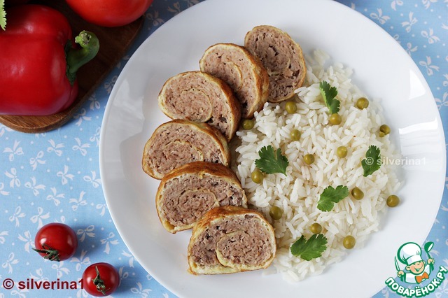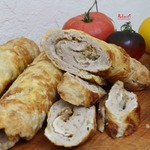 Что касается процесса приготовления, то на этапе "обвалять с двух сторон в муке" я попала впросак, но на втором рулете изобрела удобный способ (может, пригодится: небольшую лепешку фарша, с ладонь, выложила в тарелку с мукой, уже там руками раскатала до нужного размера, присыпала сверху мукой. Далее сложила её вдвое, как блин, и в таком виде легко перенесла на тарелку с яйцом).