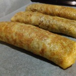 Перекладываем в тарелку и аккуратно сворачиваем рулет. Делаем это сразу же, как только сняли лепешку со сковороды, иначе рискуем получить трещины на рулете, как это сделала я, замешкавшись со второй лепешкой и забыв свернуть предыдущую (см. фото)