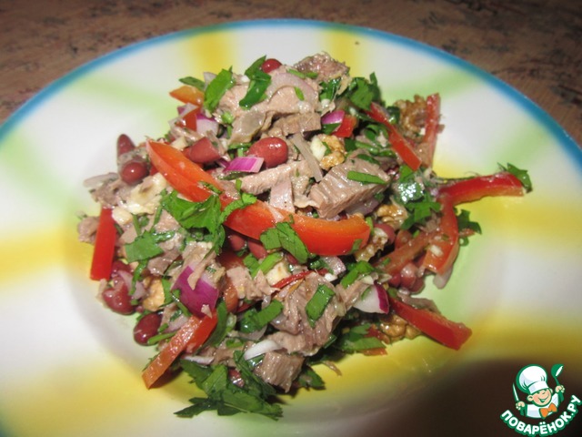 Остывшую фасоль добавляем в салат. Затем добавляем измельченные не совсем мелко орехи, предварительно очистив от кожуры ( чтобы легко очистить орехи залейте горячей водой и кожура легко очиститься).