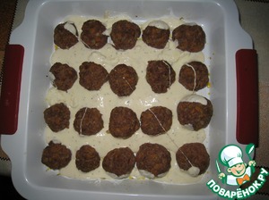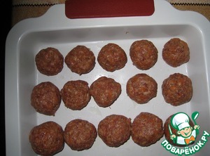 Формируем маленькие тефтельки размером с грецкий орех, выкладываем в смазанную форму. Запекаем до золотистого цвета в духовке при 160 градусах 10 мин.