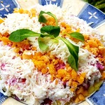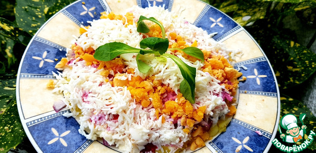 Все слои пропитать майонезом. И последний слой - яйца, тертые на мелкой терке. Чередовать белки с желтками - полоска белая, полоска желтая.