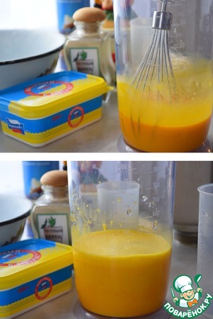 Яйца взбить миксером в пену и добавить столько воды, чтобы получилось 380 мл.
