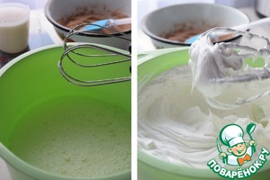 Охлажденные белки взбиваем до мягких пиков с лимонным соком. Добавляем по 2-3 ст. л. сахара и взбиваем, постепенно увеличивая скорость миксера, до жестких пиков.