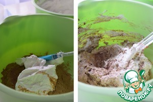В смесь из муки и какао небольшими частями (!!!) добавляем взбитые белки и аккуратно перемешиваем лопаточкой.
