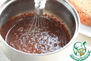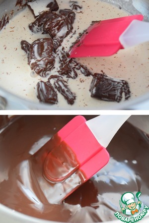 Тем временем готовим глазурь (или крем). Для этого в кастрюльке с толстым дном доводим сливки почти до кипения, добавляем поломанный на кусочки шоколад и размешиваем до его полного растворения.