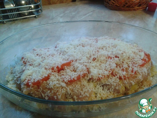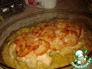 Сверху картофеля выложить курочку в майонезно-чесночном соусе. Порезать помидоры кольцами, положить на мясо. Натереть оставшийся сыр, налить в форму кипяток по уровню картофеля. Поставить запекать на 1,5 часа в разогретый духовой шкаф.
